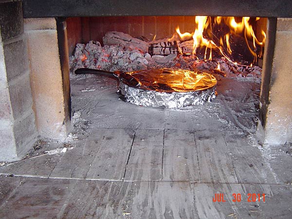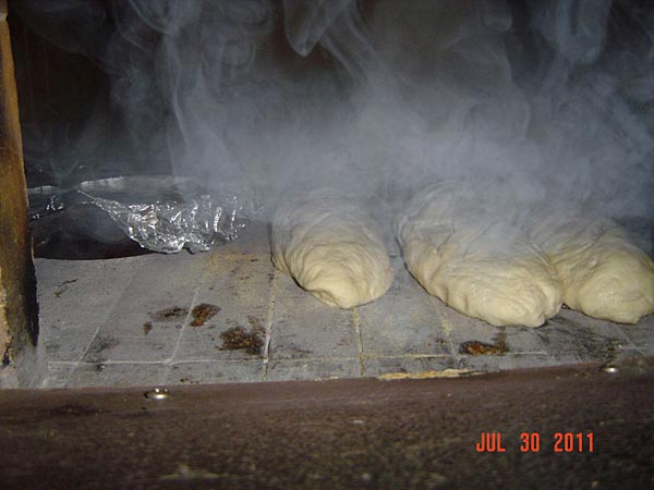 You asked me to send you any photos if I was cooking in my wood-burning oven, I snapped photos of the different steps in the making and cooking. My daughter asked if we could make pizza again because it was so good last time, as you know any cooking takes planning, time and preparation but I wanted to get as much good stuff out of our oven in one fire heat up as possible so Pizza, Lasagna and Bread were all on the menu. Before you get an image of overweight people sitting around a table, let me defend myself by stating the Lasagne and Bread will be consumed a day or so later! “Unless I get late night munches”. I have never cooked Lasagne in a wood burning oven before but my believe was I would be able to insert the skillet while the fire is starting and position it near the opening, then move it just inside to the left or right side while we cook our pizza’s. I needed to make these adjustments as most conventional ovens cook/bake around 375 or 400 degrees range. After cooking the Lasagna and pizza we will bake a few loafs of bread. The breads go in and I spray water in the oven and close the door.