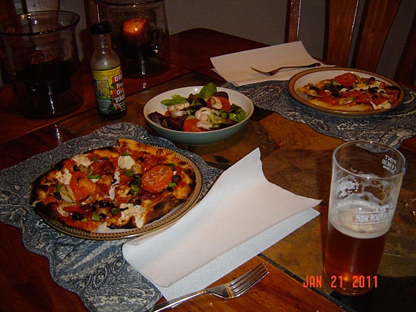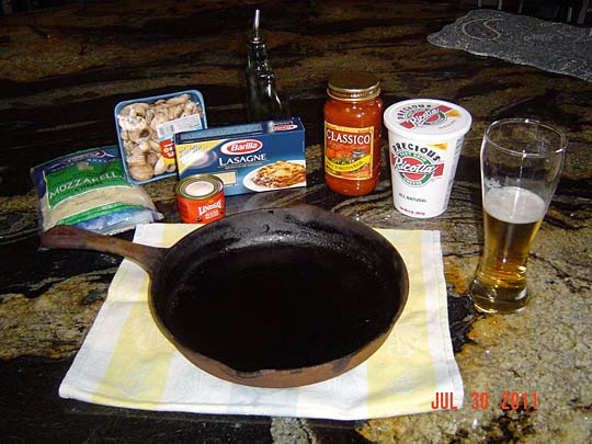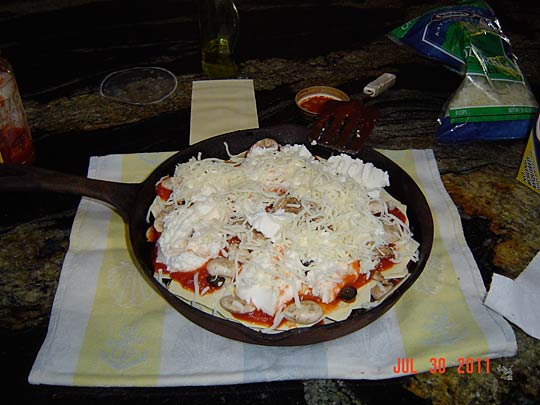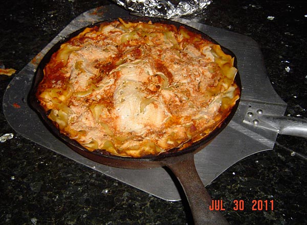 Last time I provided our pizza recipe so I will omit that but I thought I would share the Lasagne. I used a cast iron skillet, rubbed with olive oil, then a layer of sauce in the bottom, a layer of Lasagne pasta (No boiling required) ricotta and mozzarella cheeses, olives, mushrooms and garlic. I repeated these layers three times and covered it with aluminum foil.