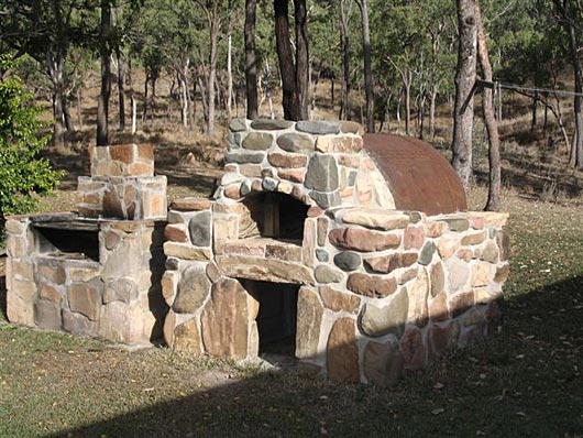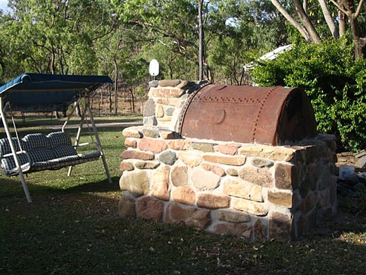 The steel part is an old steam boiler used years ago to run a steam driven timber mill – I just cut it to fit over the oven after it was finished. Carted all the rocks from a creek and hill site where I go for our evening walk. Only purchased the bricks and mortar and that’s it.