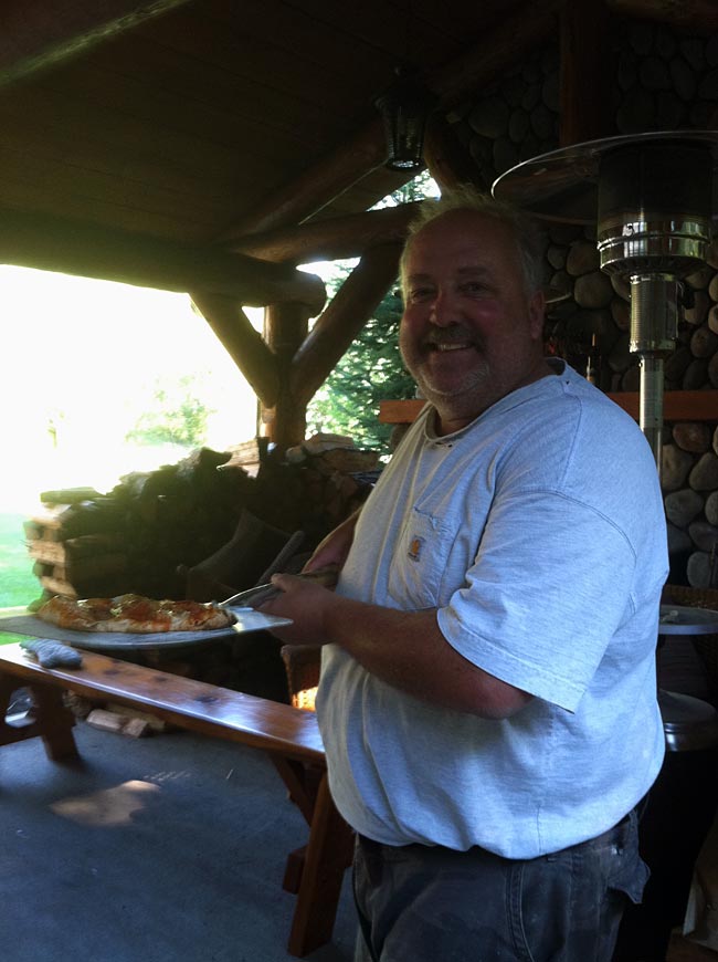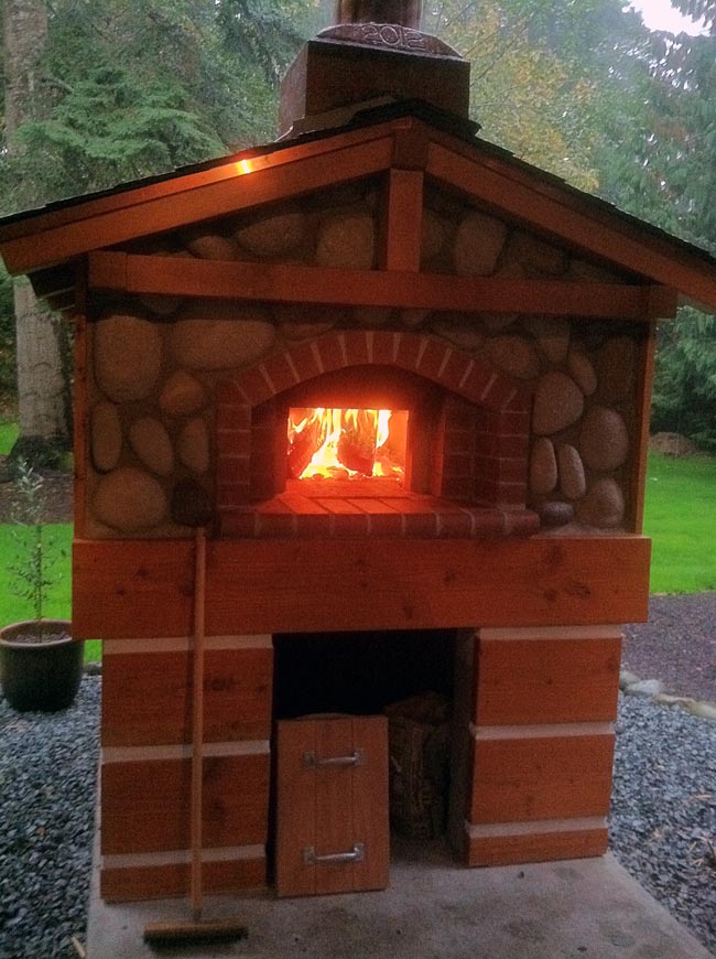 Oh, in the pictures, the oven is outside of the outdoor area made of logs, just on the other side. We sit by the fire and have a few cocktails while waiting for the oven to warm. Take care all!