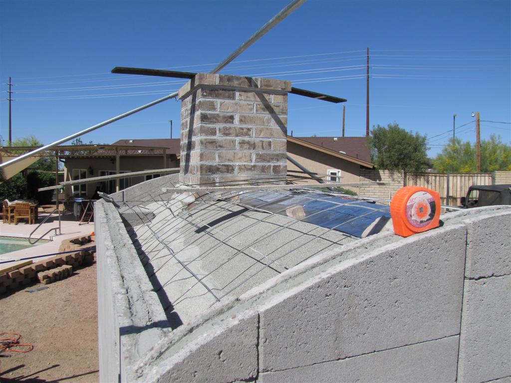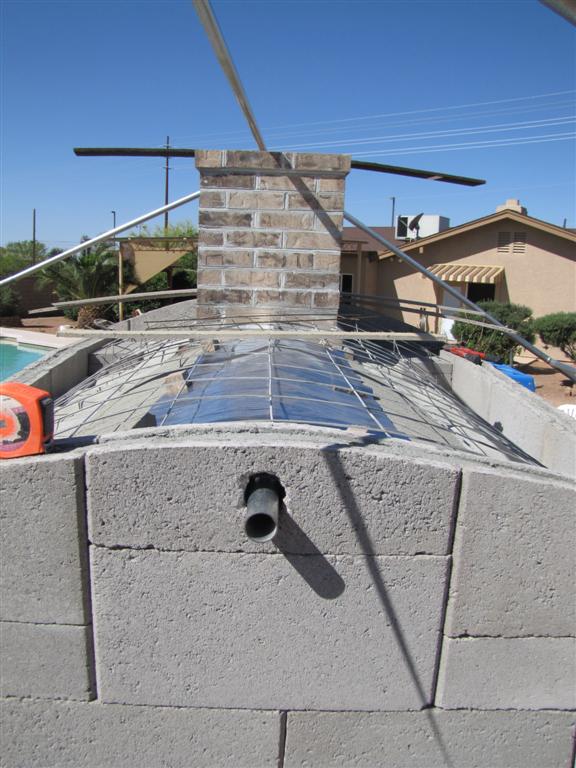 Then I put a layer of foil over it and some sand down the sides to allow venting and capped it with concrete. After the oven was fired and cooled the next day, moisture was dripping out, so the steam vent worked. I used expansion joint material around the chimney, cut it flush and sealed it after painting with a flexible sealant.