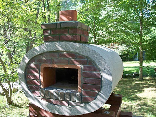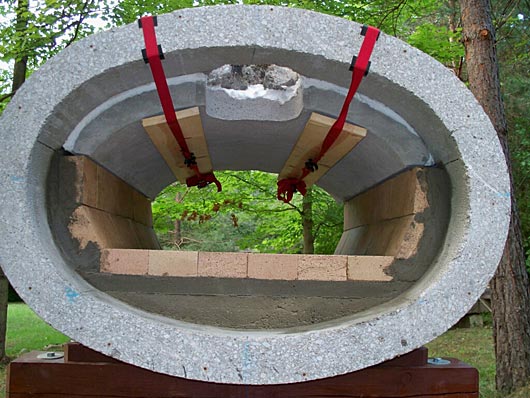 My oven is made from a 38″ = 96.52 centimeters elliptical concrete ( new ) drainage pipe. The pipe is reinforced with metal inside the concrete. I sell sheet metal equipment and metal fabrication tools and actually have sold a few things to folks over in Australia.