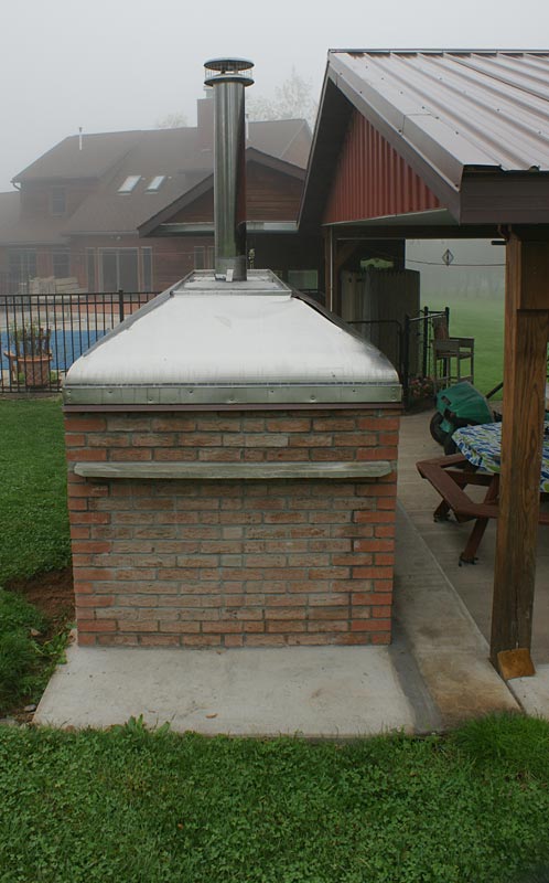 I received the plan links via your email last August and finally got to it this summer. The top cover is from a stainless steel oven hood I bought at auction from a commercial kitchen. My brickwork is clearly ‘newbie’, but I at least had the sense to do the backside (less viewed) first for practice. All three fires use a common 8″ chimney and I had planned to only use one (smoker, oven, or fireplace) at a time, but I will likely try a fire and the oven later this fall.