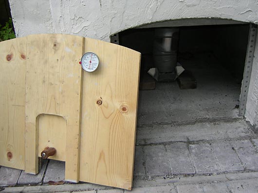 To contain the smoke in the baking chamber, I have a second lid that covers the oven chamber. I control the exit draft by tilting the lid, held by a brick.