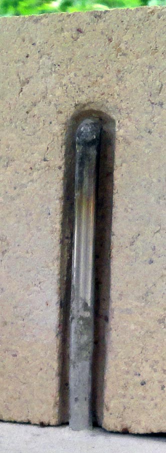 The first image, is with a hole drilled in the center floor firebrick to within 1″ of the surface. It shows where the thermocouple probe is installed and fixed. The next photo shows this thermocouple probe in closer detail.