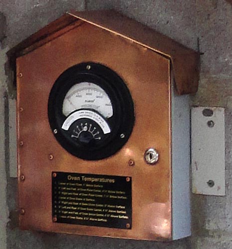 This thermometer has a 8 position rotating switch. I installed 8 stainless steel tubes in different locations throughout the oven inner cooking part, and then put thermocouples in these tubes. It definitely helps us with the cooking. I made the copper enclosure out of recycled copper sheet and rivets. I enjoyed doing the metal sheet fabrication as well.