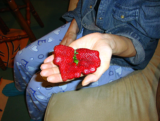 I came across this strawberry the other day. What is going on first I thought?! Three, but huge strawberries, grew into one fruit.