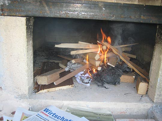 The mounting of the 5.5m height chimney is done, the whole construction is dry and we can start to fire the oven to its full power without the danger of getting a black wall. After about 1 1/2 month of building we first could see, that our plan was good and our construction works as we expected.