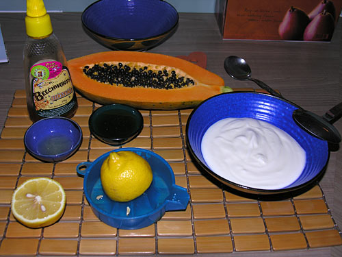 Papaya dessert ingredients Boost your Immune System with Papaya, I was feeling a bit under the weather recently,tired with the cold season upon us and tired this papaya a day myself and must say I feel great, all you do is every day for whole week eat one papaya, this will deliver great number of good quality proteins into our cells, on the third day I already felt more energized, I believe this was due to getting rid of all undigested protein from my body, so I felt cleaner. I found that the easiest was to consume papaya fresh on its own or as a part of fruit salads. If you wish you can improve the taste of papaya with few lemon or lime drops, you can have papaya with the slice of a nice cheese as entrée. In the fruit salads I like to combine it with oranges, grapefruit or try currents. There are many different ways how to prepare and consume papaya, and this is just one of them, a nice quick recipe for papaya with yogurt. Great way to start your day with or great way to finish your lunch or dinner.