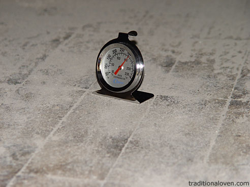 When the subject turns to analog oven thermometers and cooking in wood fired ovens; you will find out, that is if you haven’t already, that measuring temperature with these marvelous self standing stainless steel thermometers is done/useful only when the wooden door is closed – that’s when temperature in the cooking chamber evens up for baking or long time slow roasting and so on. Otherwise there isn’t point to measure the atmosphere inside while firing or when the entry door is opened because logically the temperature conditions are very different at vault level vs. bottom floor. The carbon burn-off gives you a high pizza temperature reading,